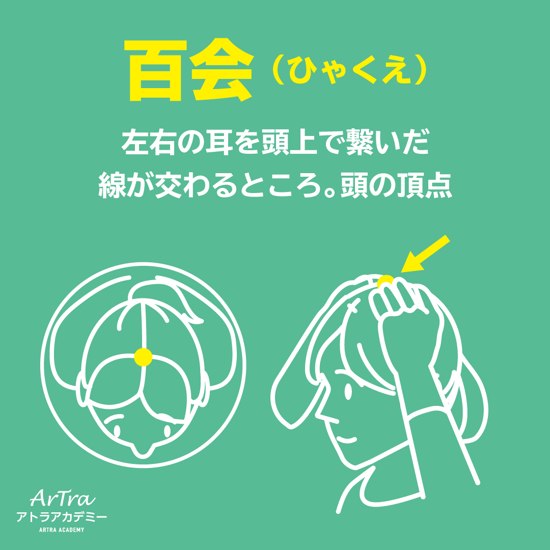 「百会」(ひゃくえ):頭頂部、両耳と鼻の延長線が交わるところ。体の中心に向かって垂直に押す。(頭痛、肩こり、眼精疲労、自律神経を整えるなど)