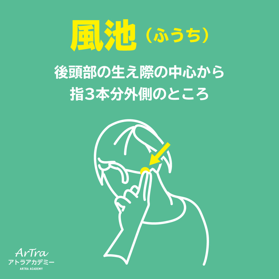 「風地」(ふうち):耳の後ろの骨と、後頭部のくぼみの中間。(頭痛、肩や首こり、鼻づまり、のぼせなど)