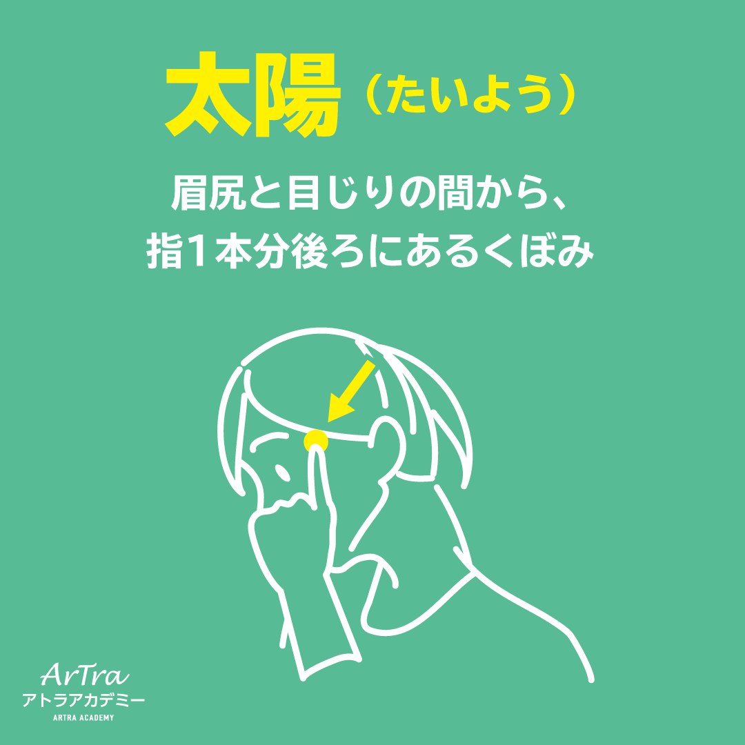 「太陽」(たいよう):目と眉、それぞれの端の中間点から指2本分外側にあるくぼみ。(頭痛、眼精疲労など)