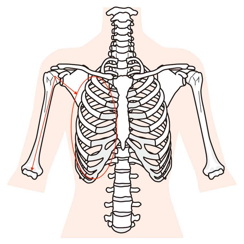 赤丸で示したところが肋骨になりますが、胸椎や右側肋骨に可動性低下や歪みがあると、上腕骨頭(肩)が赤の矢印の方向に引っ張られるチカラが働きます。