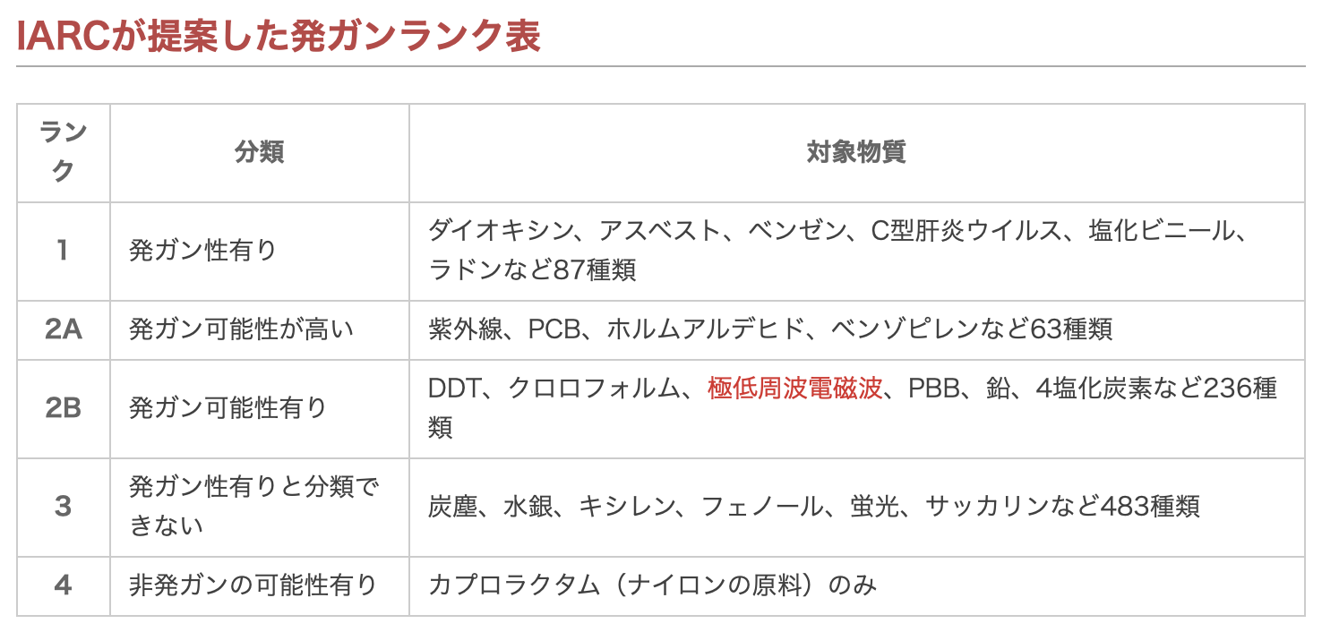 WHO(世界保険機構)の下部機関であるIARC(国際ガン研究機関)は2001年6月27日にフランスのリヨンで、50~60ヘルツの極低周波磁場は発ガンクラス「2B」の「人体への発ガン可能性有り」を全会一致で正式にランク付けをする画期的な発表を行いました。この発表を受けて、WHOは各国政府や電力業界に「予防的な対策」として