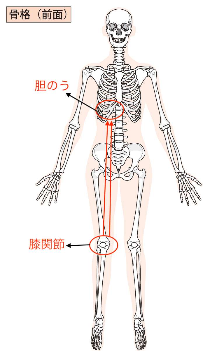 膝関節でいうと、図のように胆のうがあった場所へ、引き寄せられるようにして力が働きます。