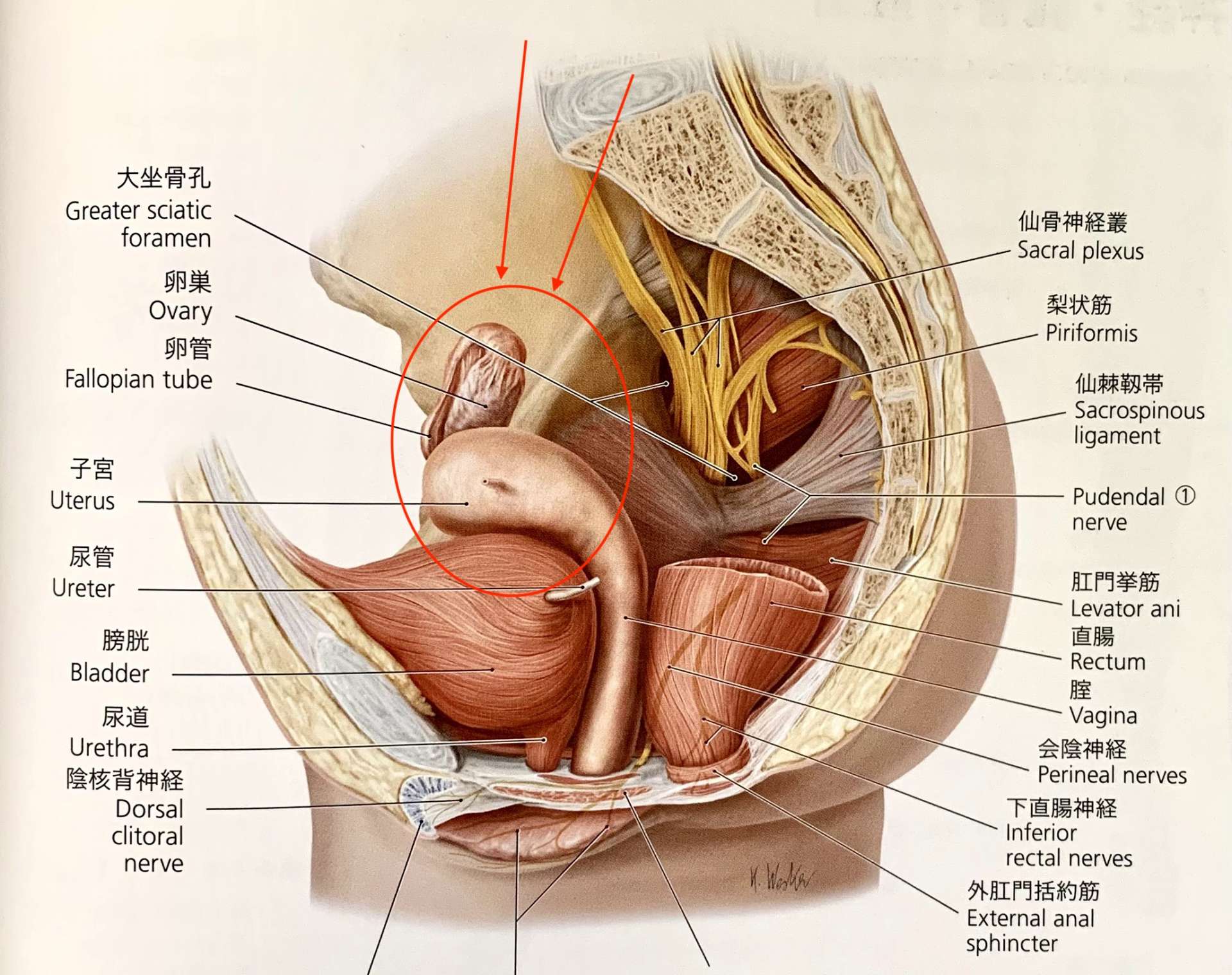 子宮と卵巣の位置に赤丸がしてあるのが確認できると思います。