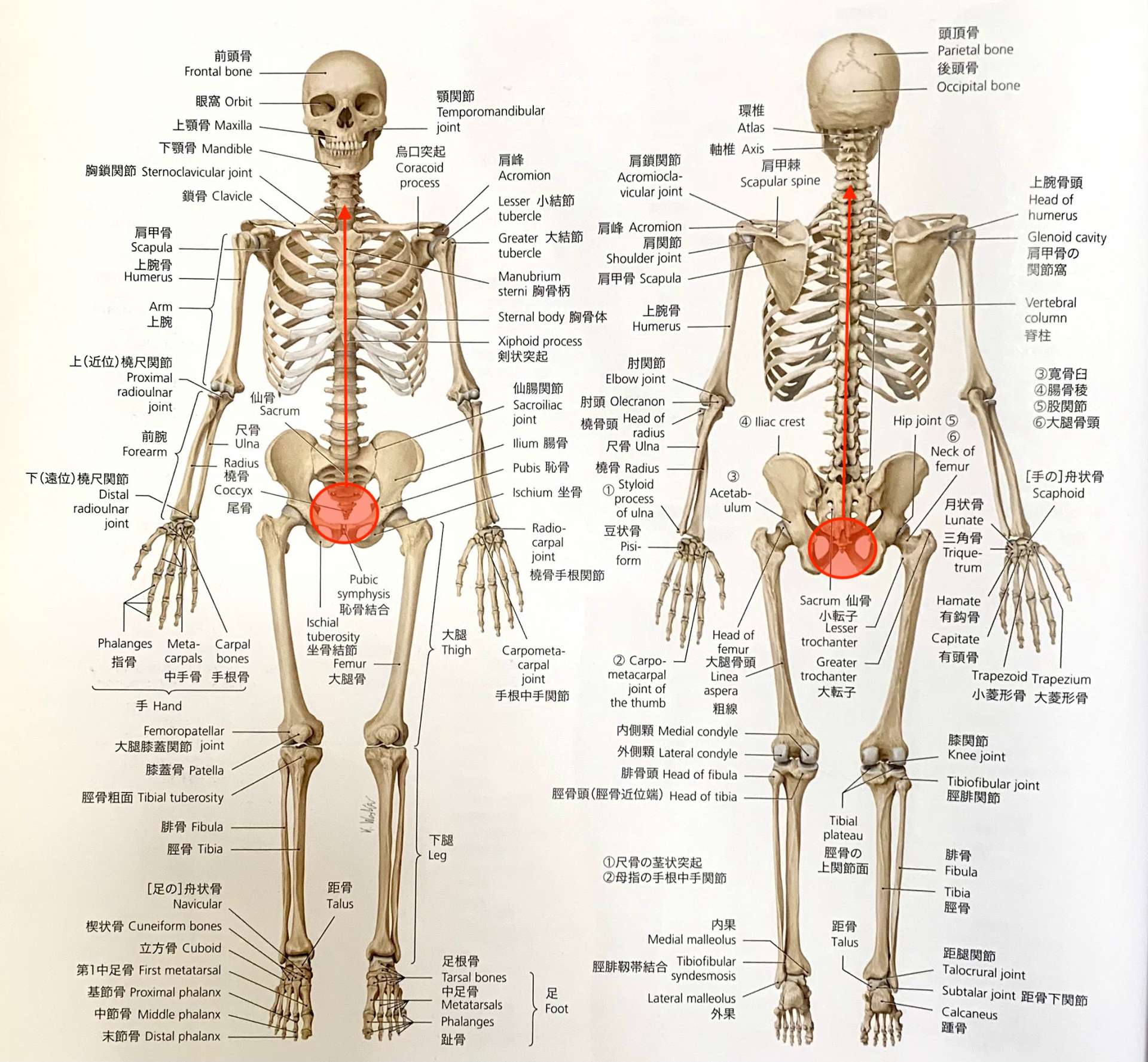 また、赤丸の部分に衝撃が加わった時のことを想像すると、赤丸の部分から矢印が出ているのが確認できると思いますが、尾てい骨で打った衝撃というのは背骨を伝わって首、頭の方まで衝撃が伝わることになります。