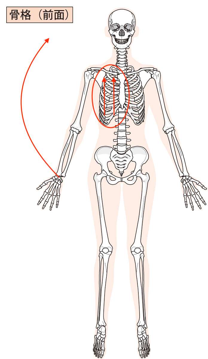 腕をあげる時、実は「肋骨」も矢印の方向へ向かって上に上がっていくのですが、この動きが制限されていると腕の動きも制限されてしまうことになります。