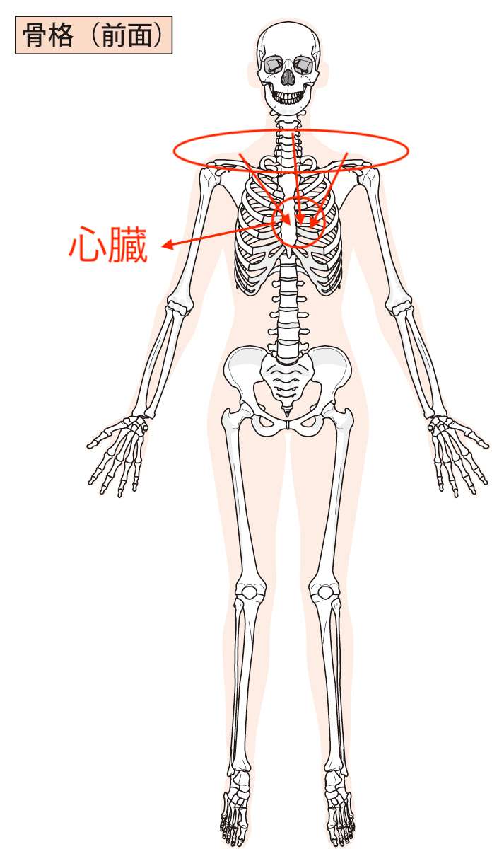 肋骨や胸骨の緊張から胸郭(胸まわり)全体が緊張を起こすと、肩関節、肩甲骨、首が心臓の方向へ向かってけん引されるような力が持続的に働くようになります。