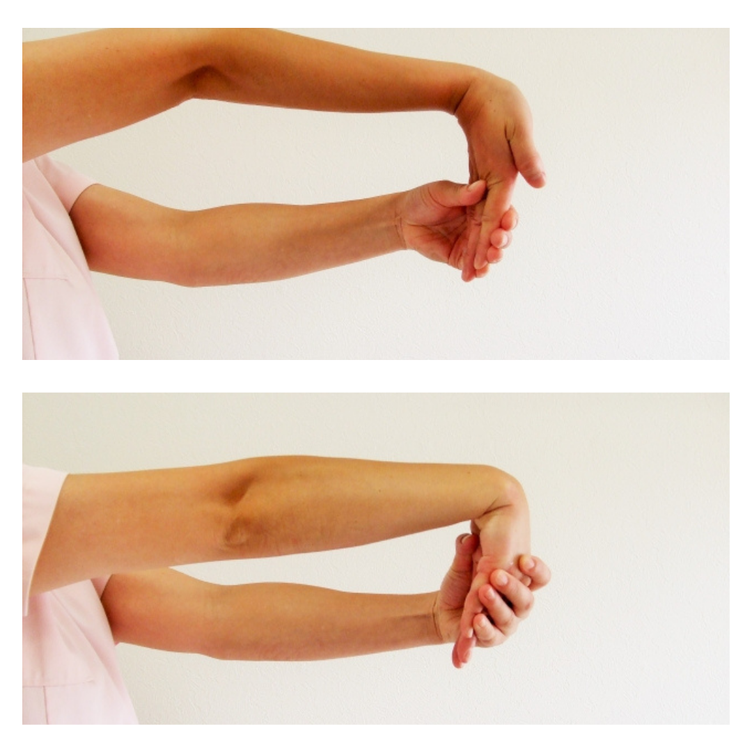 上記のような姿勢で前腕が「ピーン」とストレッチする位置でキープ、10秒数える。ストレッチがかかると、さらに可動域が増してくるので、さらにストレッチがかかる位置にもっていってキープ、10秒数える。これを3回繰り返す。