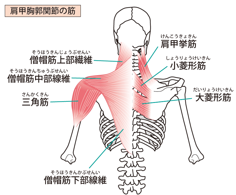 いわゆる「肩甲骨はがし」で用いられる筋肉がこの僧帽筋。