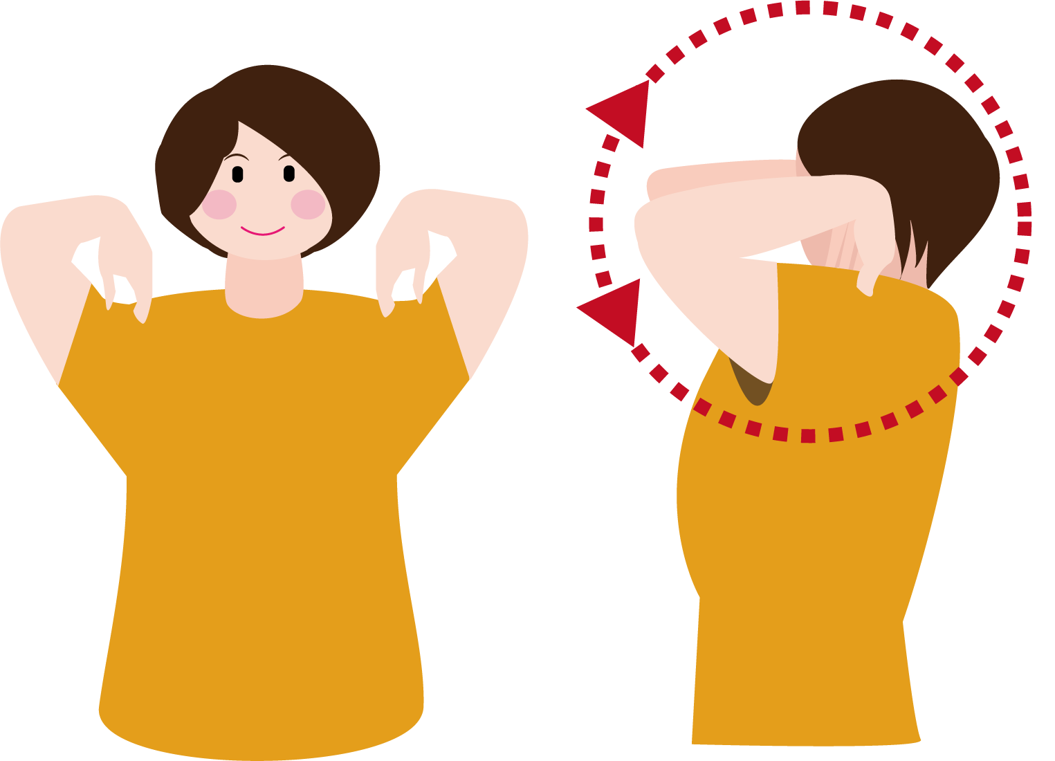 ①両手を肩に乗せて肘で大きな円を描くように、前から後ろに回します。これを30秒間行います。