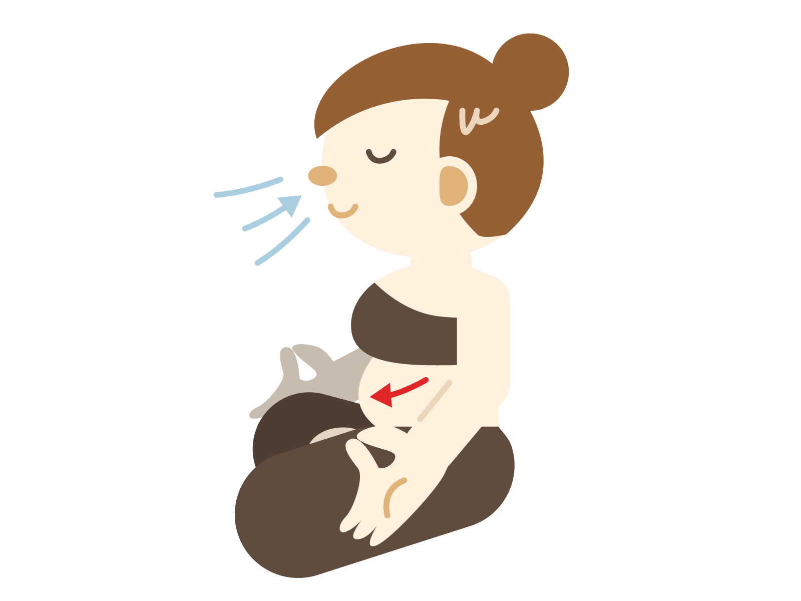 下腹部(おへその下の部分)と肛門の力を抜いて、おなかをゆっくりとふくらませながら10秒で鼻から息を吸います。